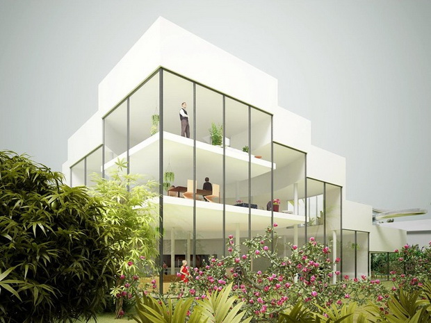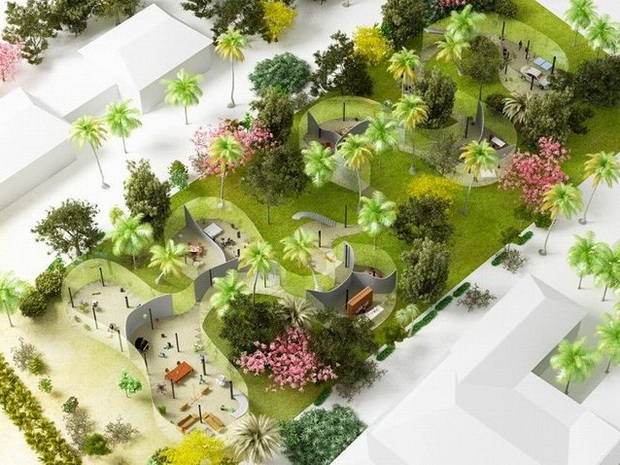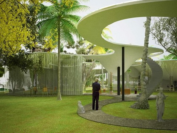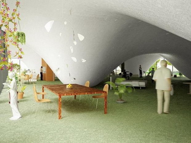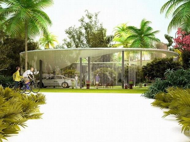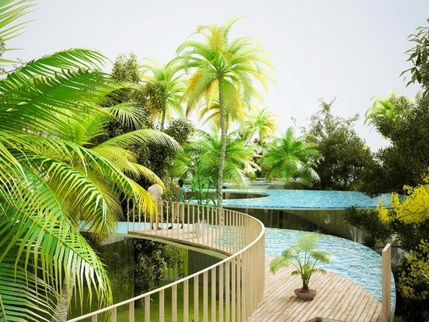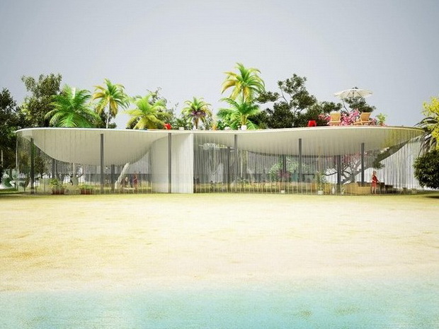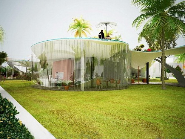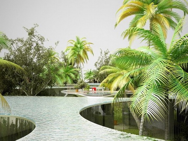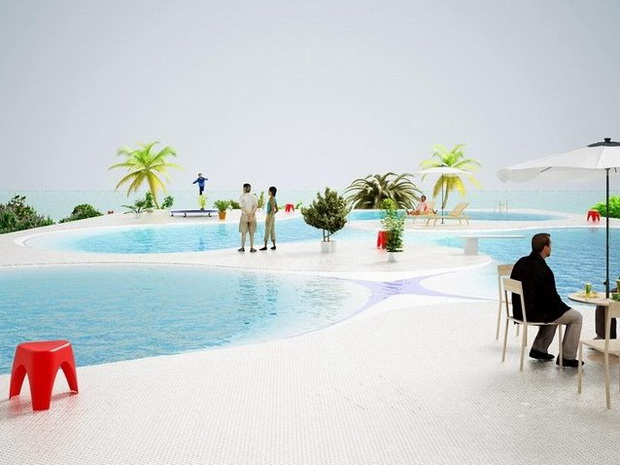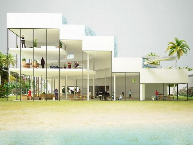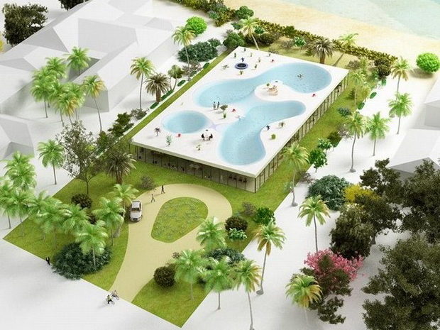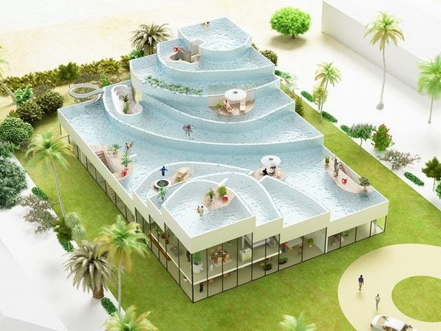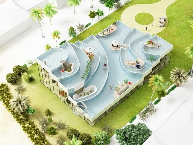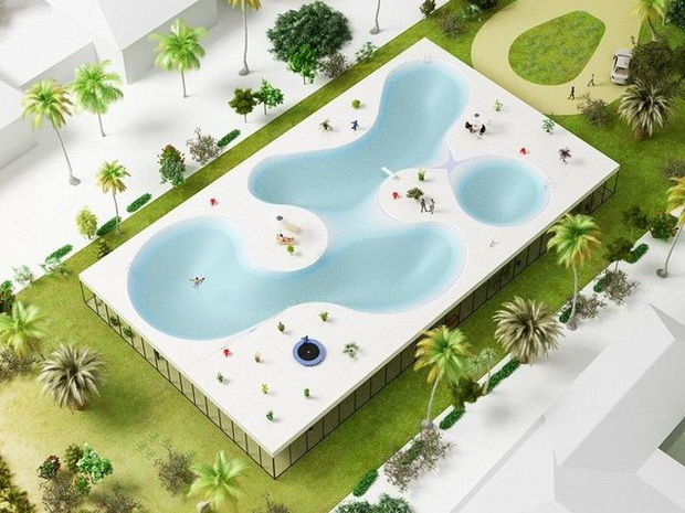 來自荷蘭的NLarchitects建筑事務(wù)所總能為我們帶來不一樣的新奇想法,很快他們設(shè)想了三個方案。都是將泳池架設(shè)在住宅的屋頂,房子的生活區(qū)位于泳池下面,以通透的玻璃幕墻圍合。通過泳池的不同形狀與深度劃分出下面的空間,上面的泳池儼然成為一個水上樂園!